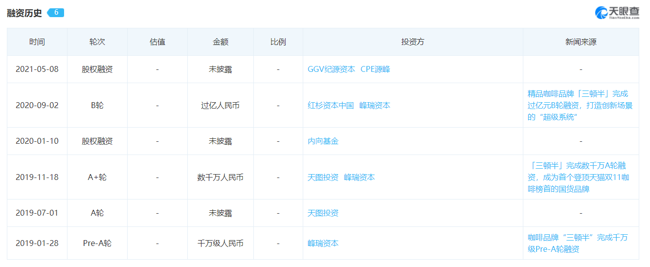 2015年成立于长沙的年轻国货咖啡品牌——“三顿半”,力压雀巢、星巴克两大咖啡巨头,连续两年登顶天猫“双十一”咖啡类目榜首。天眼查数据显示,三顿半从2019年初开始融资,至今已有六轮。2020年9月,三顿半完成过亿元的B轮融资,投资方峰瑞资本、红衫资本、天图投资,皆为消费赛道的明星投资机构。
