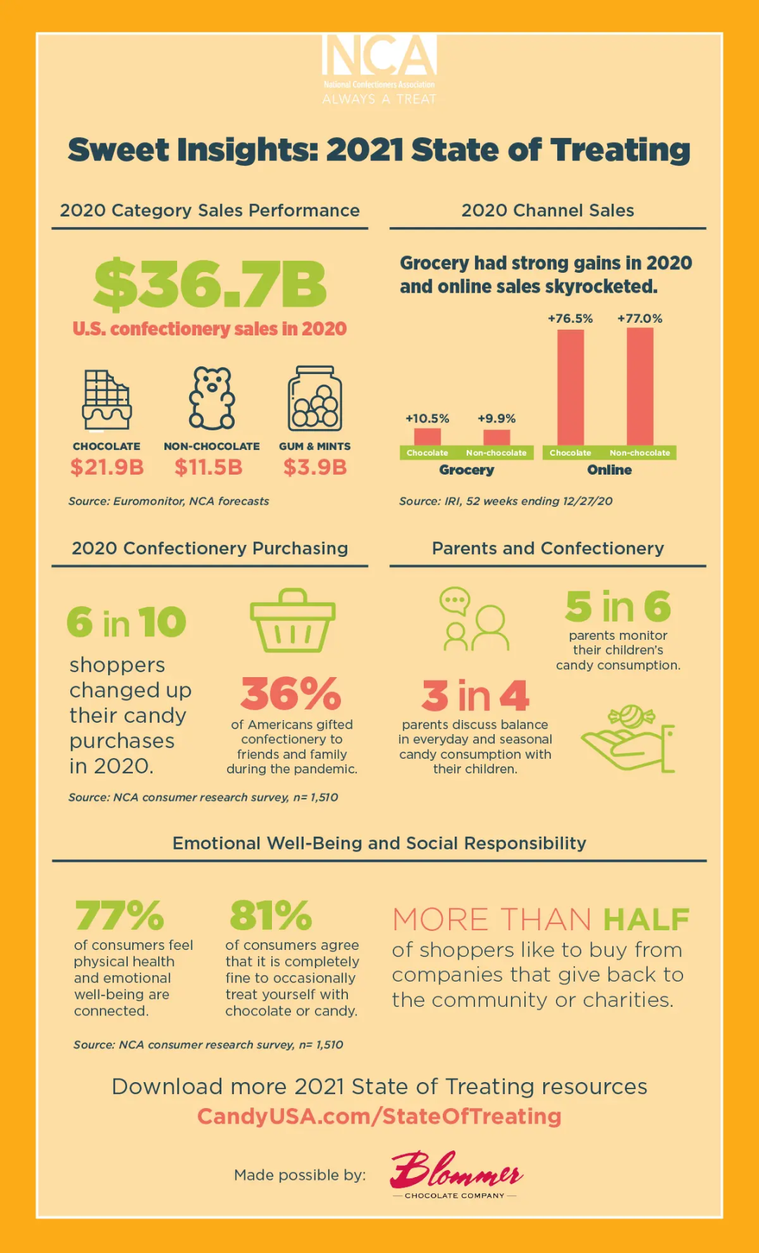 动荡的2020年撼动了食品零售领域,新型冠状病毒牢牢控制了人们食用糖果零食的地点和方式。疫情的大流行促使了许多消费方面的变化,比如旅行次数越来越少、购物筐越来越大、店铺越换越勤、网上购物记录越来越多等等。