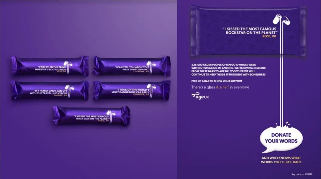 比如此前吉百利在英国发起的一项旨在解决老年人孤独的情感活动,在今年4月,吉百利删掉了1000万个牛奶巧克力包装上的品牌和宣称等信息,取而代之的是选取了6个来自不同行业老年人分享的他们各自的精彩经历。品牌希望通过“Donate Your Words”(捐赠你的话语)活动让更多的年轻人开始与身边的老人进行交流对话,重视老年人的孤独问题。
