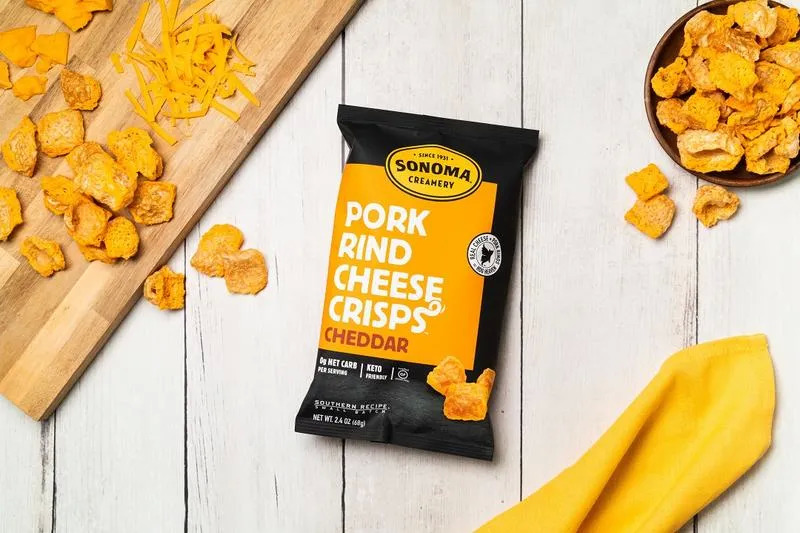 高蛋白趋势也催生奶酪零食成为增速很快的新品类,今年博览会上关于奶酪零食的创新也层出不穷。比如Sonama Creamy就创新的将奶酪与猪皮结合在一起烤制成猪皮奶酪脆片,这应该是市面上首次出现这种类型的产品。