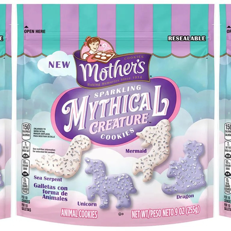 比如说Mother‘s品牌在最近推出的Sparkling Mythical Creature Cookies,有独角兽、海蛇、美人鱼和龙四种神话生物形状饼干,覆盖着薰衣草色和白色糖衣,并装饰有闪闪发光的亮片。这种饼干的概念其实非常符合北美社交媒体上比较流行的梦幻食品趋势,类似于INS上比较火爆的独角兽主题,容易让消费者自发拍照分享,从而形成传播和话题。