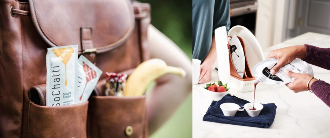 比如 SoChatti将巧克力经过烘焙研磨后制成融化的液态形式,从而提供真正的风味、香气和最纯正的巧克力体验,给最挑剔的巧克力爱好者留下深刻印象,就像咖啡和葡萄酒一样,每个品种都根据咖啡豆的原产地呈现出独特的味觉体验。将巧克力从传统的固体巧克力变为可随时应用在各个场景的流体酱,而无需再度加热融化,不仅放大风味,同时也更加方便的匹配更多场景。