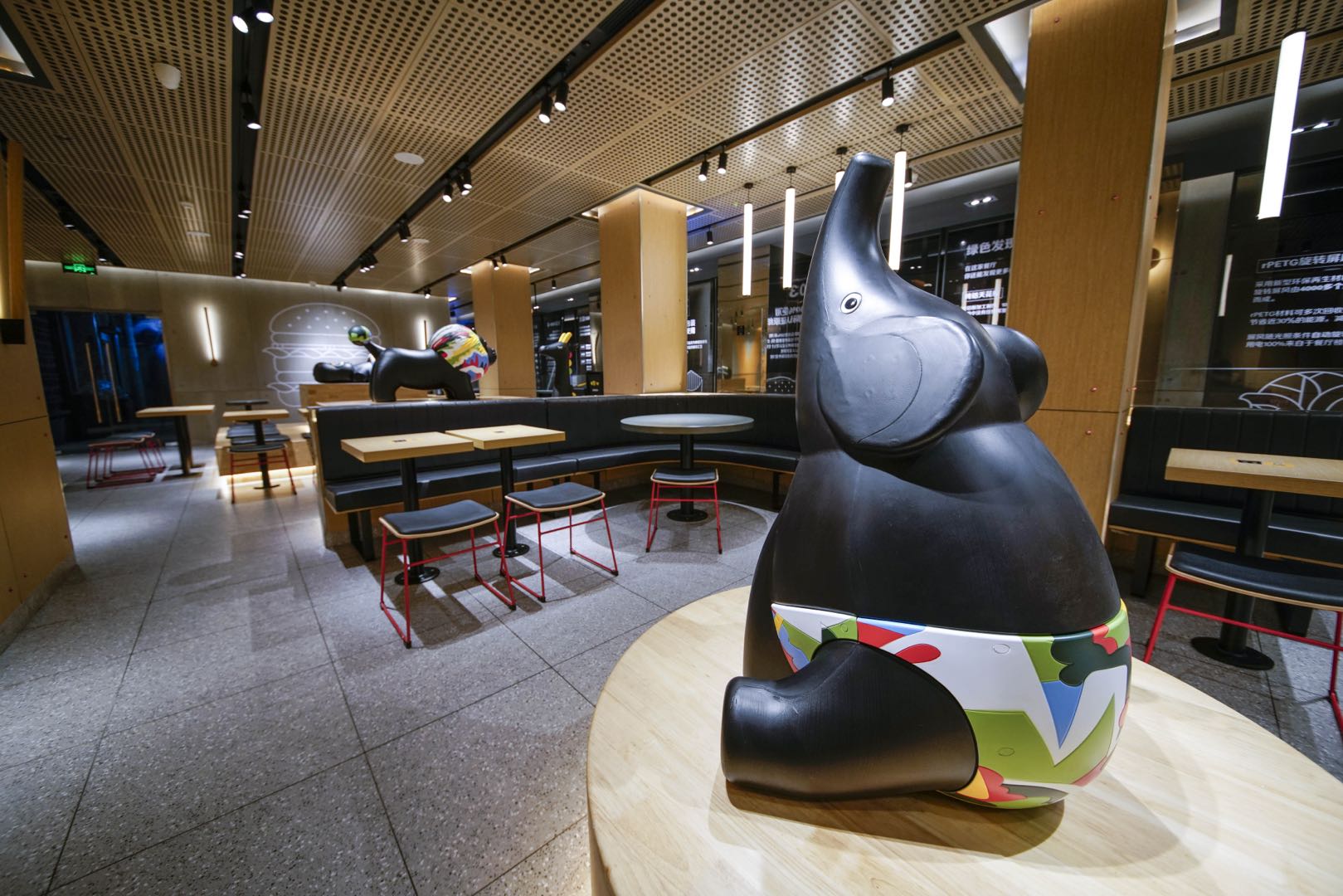 例如这家门店的室内装饰采用可回收再利用的材料;二餐厅座椅由100%海洋塑料回收制成,它的宝宝椅子,也是用开心乐园餐的塑料玩具回收制作而成。这家餐厅的照明系统,则采用16回路感光自动调节灯光系统,可以根据室外光线的强弱自动调整。开心乐园餐玩具“变身”的宝宝椅今年开始将陆续进入麦当劳餐厅,此外还有其他用塑料玩具回收后制作的周边也会上线发售。