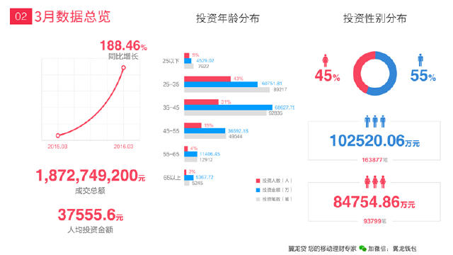 这是某P2P网贷平台三月份的投资月报数据,在这组数据中,有个数字值得一提,那就是“人均投资金额37555.6元”,看到这个,你还能说,投资P2P的都是屌丝吗?