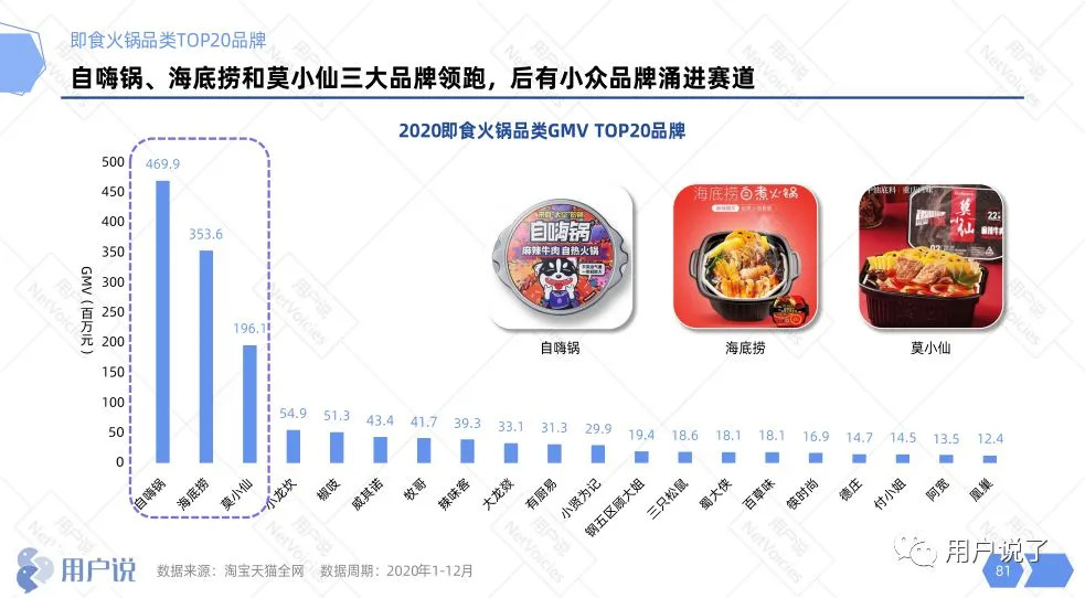 比如自热小火锅,海底捞从2017年上半年就开始试水,起步时间比自嗨锅更早。但根据淘宝天猫的数据,2020年海底捞小火锅的GMV为3.5亿元,落后于自嗨锅的4.7亿元。