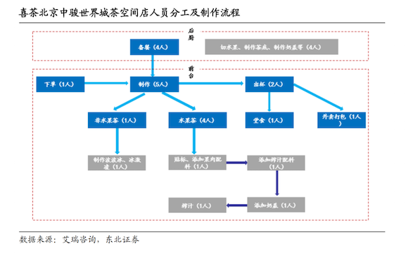 在喜茶,仅饮品制作就需要5个岗位(甚至还包括一个试吃的岗位)。“我们希望每一步都会激发食物的特性,最后呈现出来是一杯完美的饮品,前面厨房里面还有不同的步骤,切水果、洗水果,捣果泥这些东西。它就会变得相对比较复杂。”张骏说。