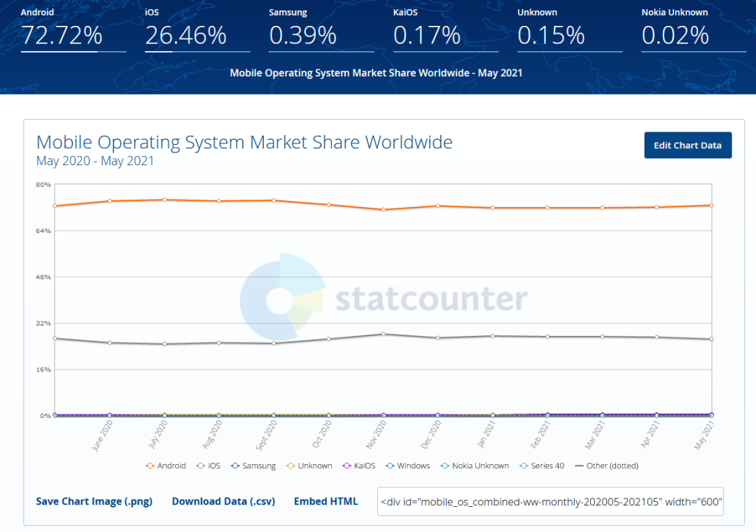 美国网站通讯流量监测机构StatCounter的数据显示,2020年5月至2021年5月,移动端操作系统市场份额上,谷歌安卓系统占比达72.72%,苹果iOS占比为26.46%,其他操作系统市场份额不足1%。