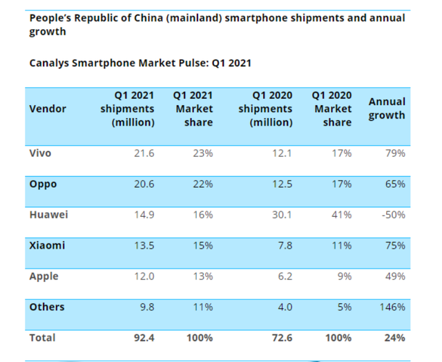 从智能手机出货量上也可见一斑。Canalys发布的2021年第一季度中国智能手机出货量数据显示,vivo、OPPO、华为、小米占据前四位,皆是采用基于安卓开发的操作系统,合计占76%的市场份额;苹果位居第五,拥有13%的市场份额。
