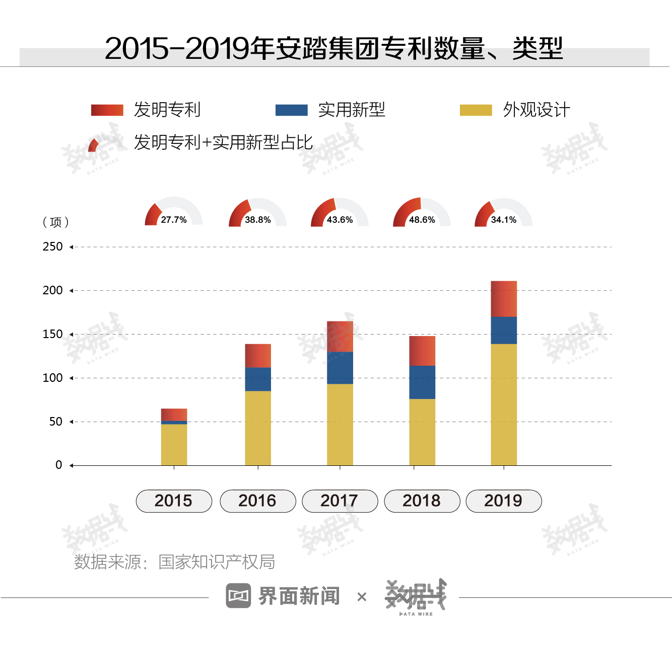 此外,安踏集团的专利数量越来越多,但质量不高。据国家知识产权局数据,2015年至2019年,安踏集团专利数量5年累计728项。其中,质量较高的发明专利和实用新型共286项,占比不足4成。