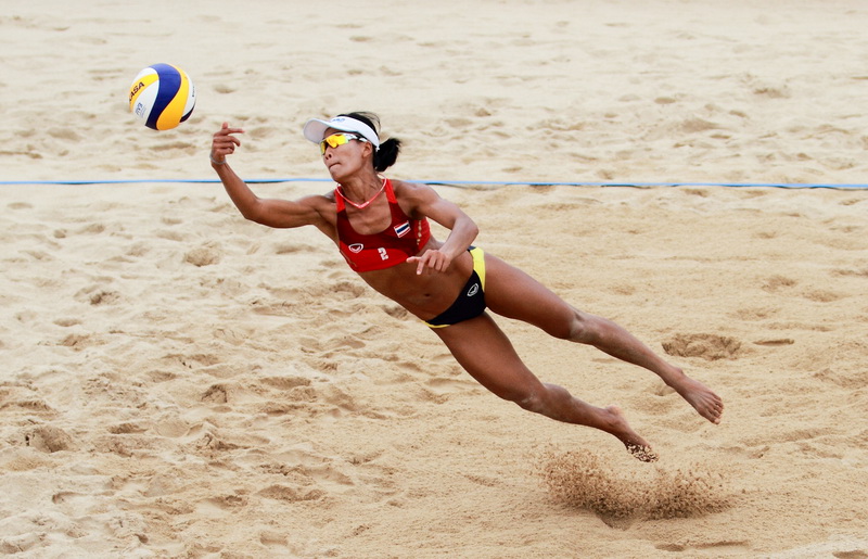 2014年亚洲沙滩排球锦标赛,泰国队员飞身救球。(摄影:赖进财)