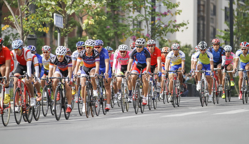 2014年第二届中国·晋江自行车公开赛 ,齐头并进的自行车选手,成为一道亮丽的城市风景线。(摄影:赖进财)