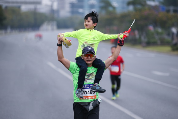 2015年晋江公安“廉能杯”半程马拉松赛,一对参加比赛的父子。(摄影:赖进财)