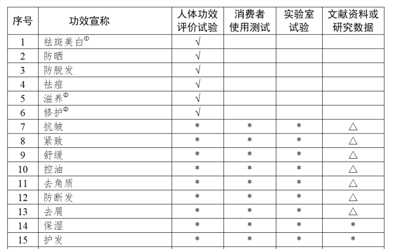 在前6个功效宣称中,祛斑美白、防晒、防脱发属于特殊用途化妆品,新规之前就要求很严格,也有明确的功效评价试验方法。而祛痘、滋养、修护原本属于非特殊用途化妆品,现在统一称为国产普通化妆品,这是它们首次被纳入人体功效评价试验的范畴。