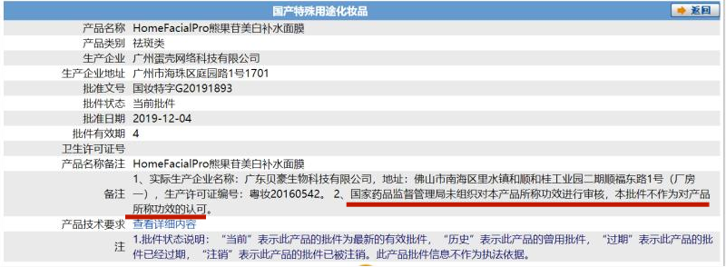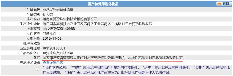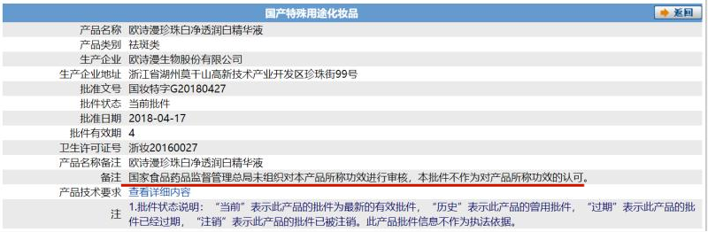 记者查询祛斑美白产品的特殊用途化妆品许可批件信息后发现,大量产品在备注中都标示了:国家药品监督管理局未组织对本产品所称功效进行审核,本批件不作为对产品所称功效的认可。这些产品的最新批件日期基本都在2017-2019年间。