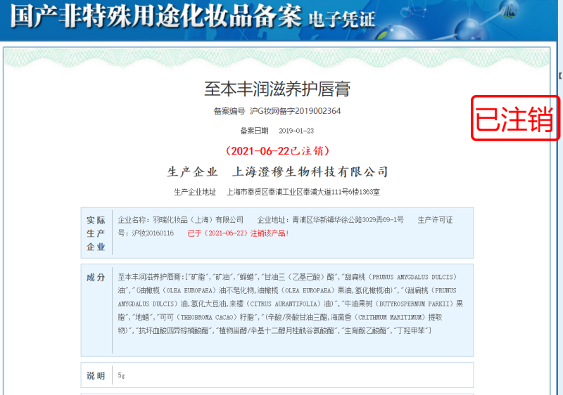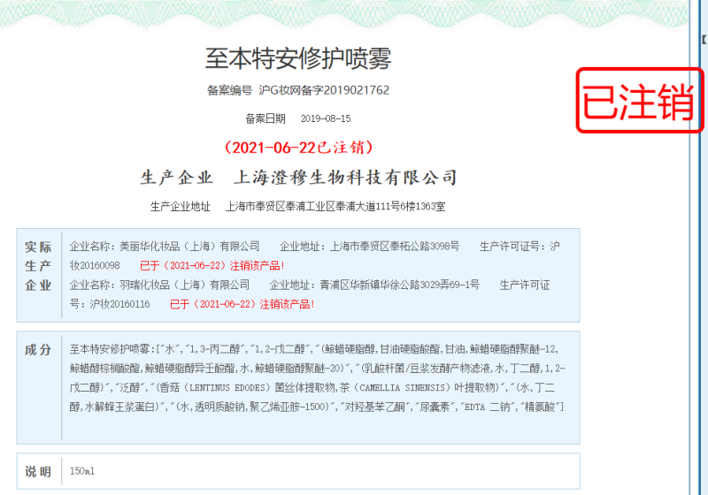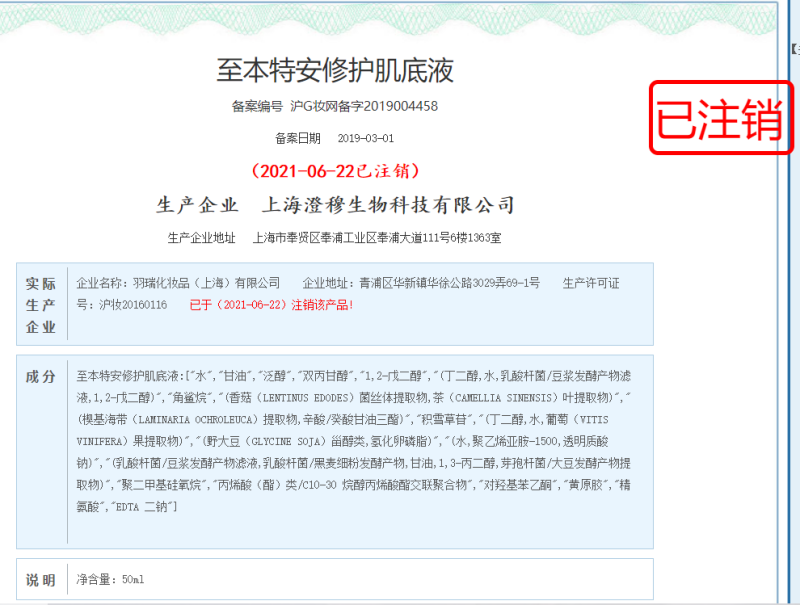不过,据记者查询化妆品备案信息后发现,有品牌比如至本,在6月份注销了2021年5月1日前完成备案的名称中含有修护、滋养关键词的部分产品。