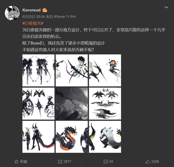 《白夜极光》最开始引起大众关注,源自其高质量的美术。从去年开始,其游戏主美兼制作人巡回犬在微博上陆续曝光的高质量游戏海报、人物立绘、Live2D等,让游戏收获了第一批粉丝。