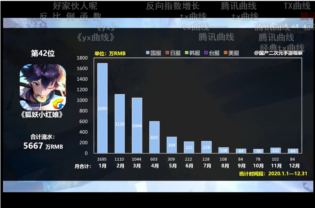 泛二次元手游《狐妖小红娘》的收入滑铁卢曲线被玩家称为“腾讯曲线”,图源B站“国产二次元观察”