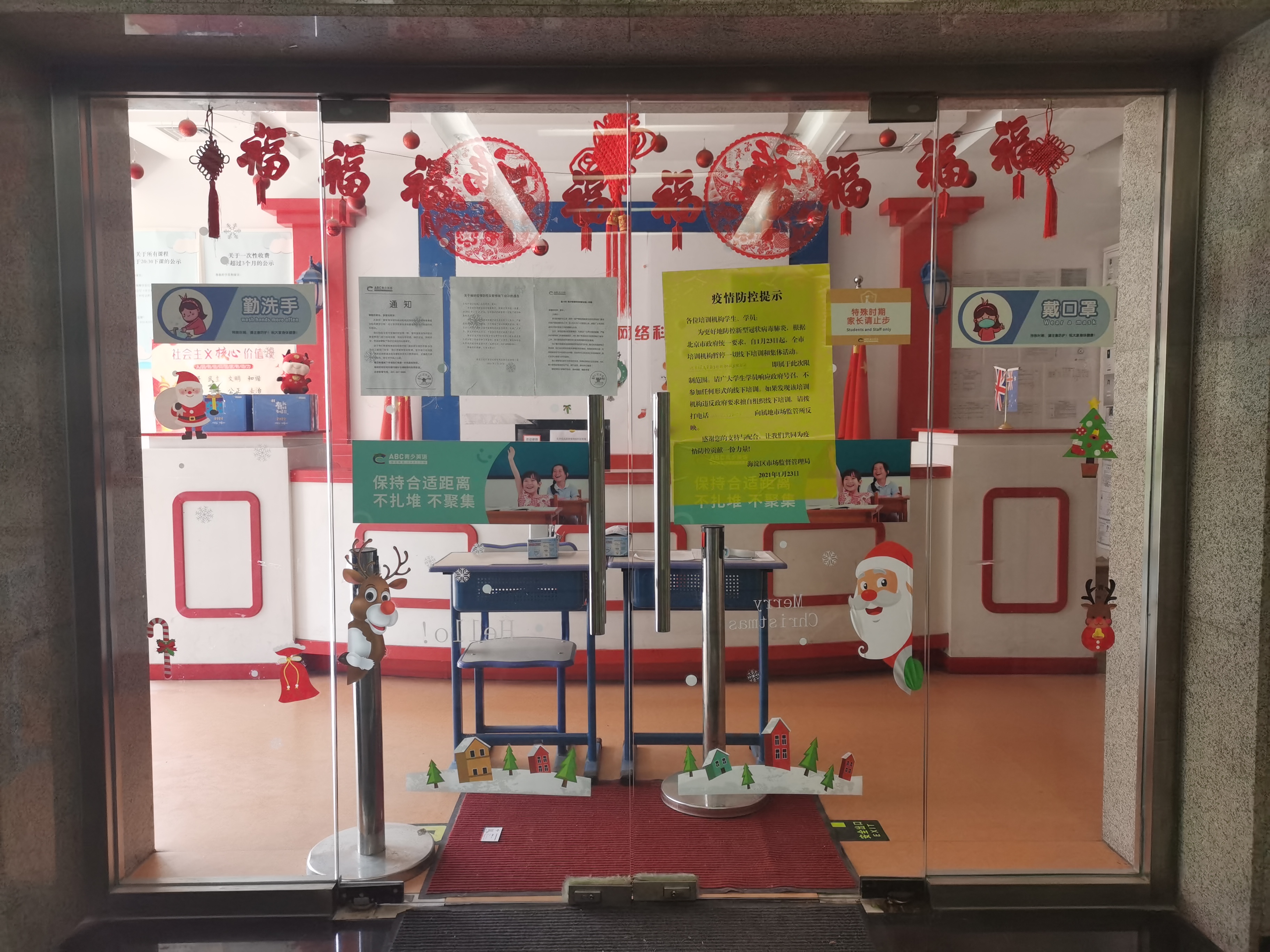 关门的是ABC外语培训中心。其大门透明玻璃上张贴有三份疫情防控通知、一份致学员及家长的信。信中写道,该店于去年9月复课,因今年疫情反复,故停止线下教学。并表示“班级群将正常运转,定期发送相关课程的知识推送、短视频课等内容。”落款日期为2021年1月20日。
