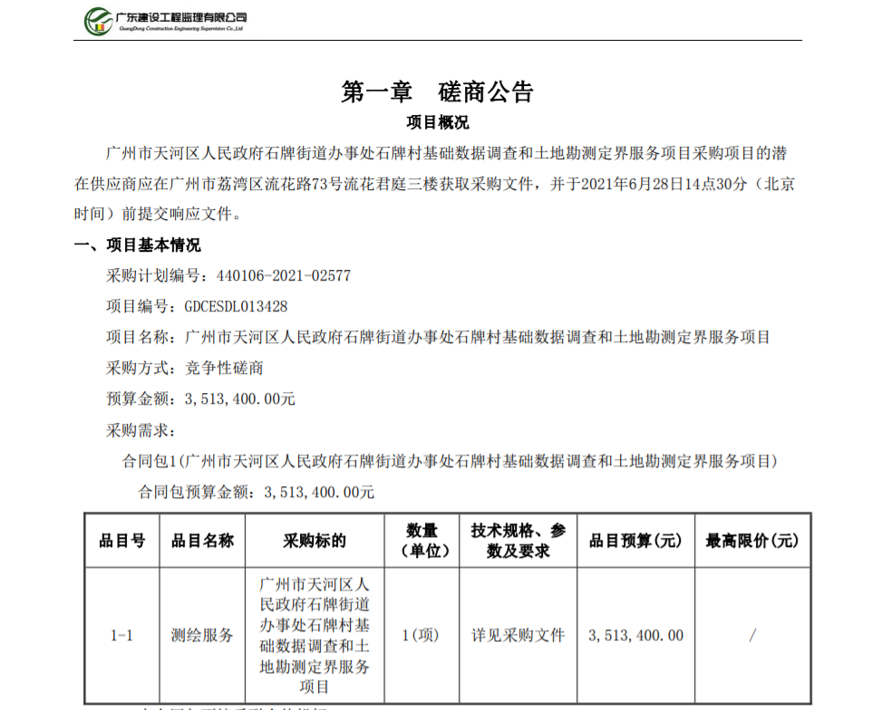 中国政府采购网刊登的一则公告显示,天河区石牌街道办事处石牌村正式对外发布“石牌村基础数据调查和土地勘测定界服务项目”的需求,采购预算金额为351.34万元。