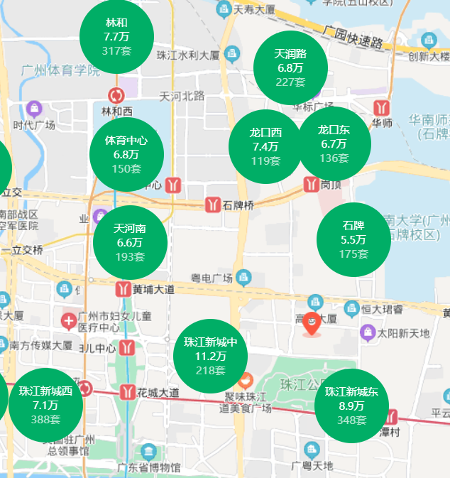 即使是价格更低的二手房源,二手房均价都已经达到5.5万/㎡。而更核心靠近岗顶站的二手房,均价已高于6万/㎡,天河商圈均价接近7万/㎡,最高的珠江新城,目前已高达11万/㎡。