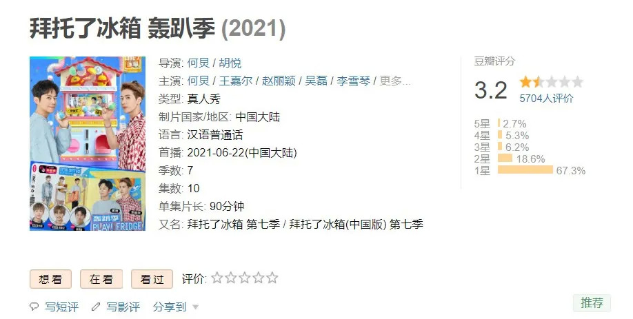 (截至发稿前,《拜托了冰箱》第七季豆瓣评分3.7分,在此之前,该系列的平均分为7.35)