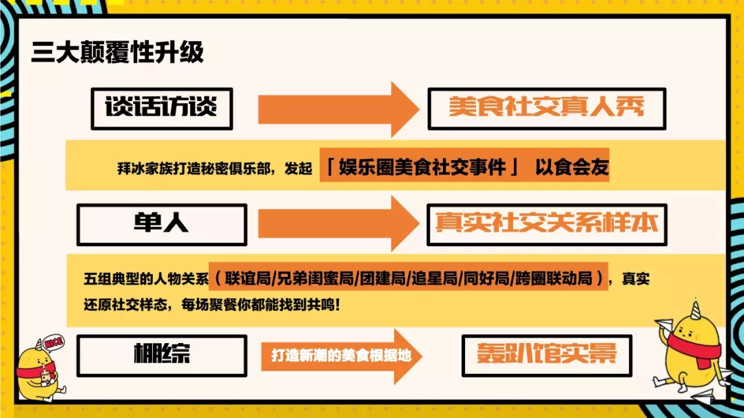 一方面,综N代要形成良性的商业运作,就必须要通过形式、内容的创新向资本讲新故事,比如《拜托了冰箱》就专门在物料投放中提及了节目的商业增值,“以美食为切入口,覆盖吃穿行。游购娱的全线生活方式的沉浸式营销……”。