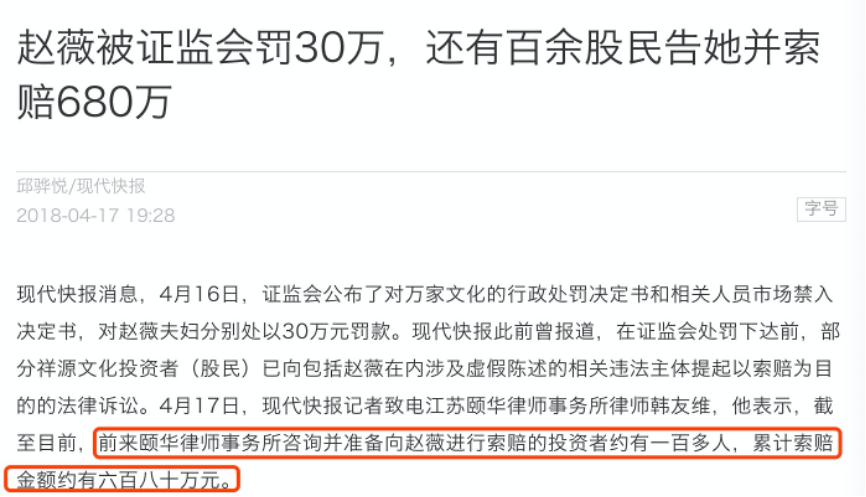 而目前赵薇陆续被爆出的股权冻结,应该是针对该收购案起诉的股民们申请的诉前保全。以高达1800多万的金额来看,索赔的股民数量以及索赔的数字比当年预估的还多,甚至翻了三倍。