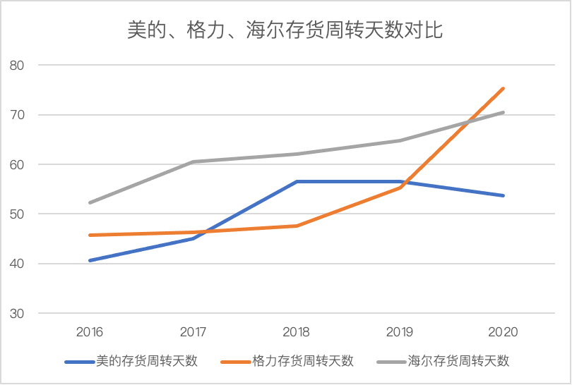 董明珠大力宣传的渠道改革看起来也收效甚微。从存货周转天数来看,2017年以来,格力的存货周转天数一直在上升,2020年的存货周转天数达到75天,说明格力有积压了较多的存货,销售状况也不如以前。