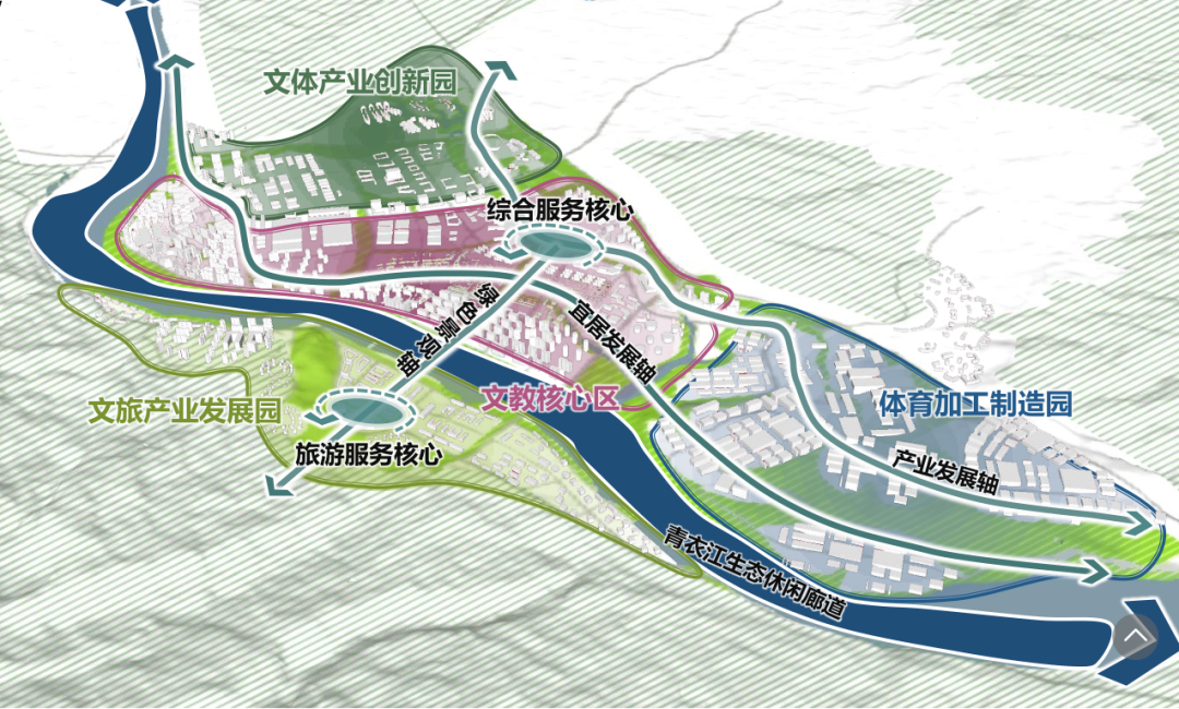 “一核”指,坚持“聚焦产业链、培育新动能”,在草坝场镇片区布局体育、教育、文化三大新兴绿色产业,激发传统产业活力,加快形成一批百亿级现代产业集群,努力将文教新城打造成为国家体育产业创新试验区和对接成都、联动三州的川西教育中心,着力将场镇片区打造成为产城融合发展的区域经济增长极、动力源。