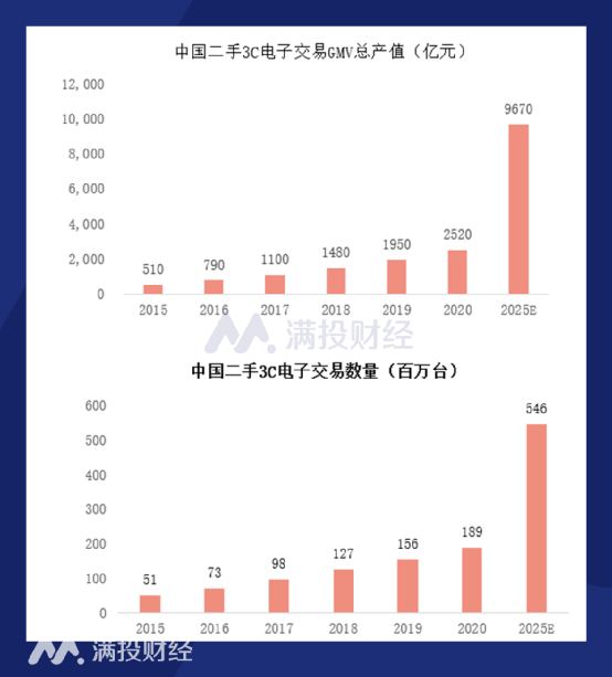 其中,中国二手3C电子2020年的交易数量为1.89亿台,总金额达到2520亿元人民币。预测到2025年,行业将快速增长,二手3C交易规模将达到5.46亿台,GMV总产值达到9670亿元,复合年均增长率分别为24%和31%。