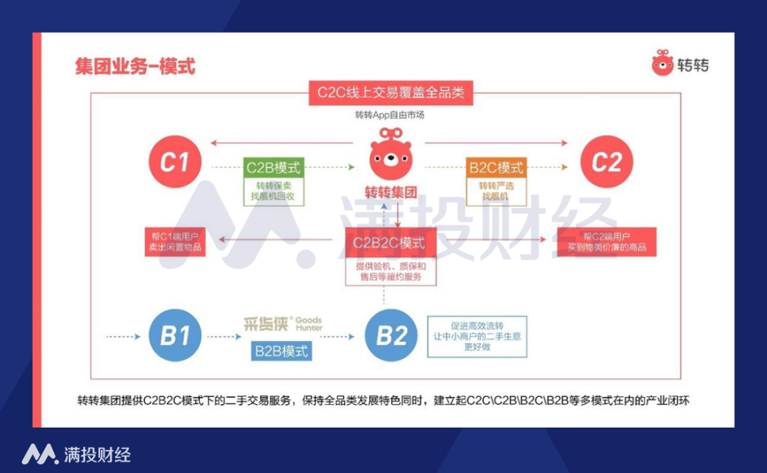 转转的业务模式以“C2C模式+C2B2C模式”为主。其中C2C是转转的核心业务模式,借助微信生态体系的顶级流量,满足用户的二手交易需求。二手电商市场虽然规模庞大,但这个赛道从不缺选手,有闲鱼、爱回收、回收宝、闪回收、同城帮等公司在竞争。