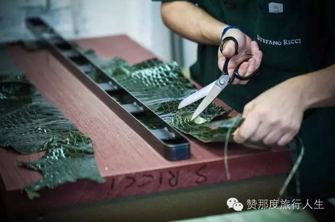 搭配如此高级的皮带扣, 皮带本身自然也要选用最顶级的材质, 而Stefano Ricci是个狂人的珍惜皮爱好者, 有着"皮中铂金"之称的鳄鱼皮是品牌最常见的素材。Ricci会亲自挑选全世界最优质的皮革: 来自新几内亚湾, 密西西比野生鳄鱼皮, 无论是成色还是皮质都是最一流的。仅需针线, 剪刀, 以及极少的手工工具, 从鞣制, 上色, 剪裁, 缝制, 打孔到最后与金属扣的组装, 都凝聚了匠人的心血。