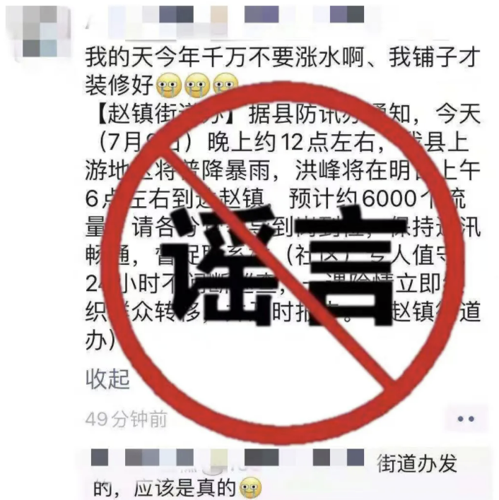 金堂县赵镇街道办官方微信公众号“花园水城赵镇”7月9日消息,近日,一则署名为“赵镇街道办”所发“金堂县上游地区7月9日晚普降暴雨,洪峰将在明日上午6点左右到达赵镇,预计6000个流量”通知内容在微信群、朋友圈流传,引发当地群众恐慌。