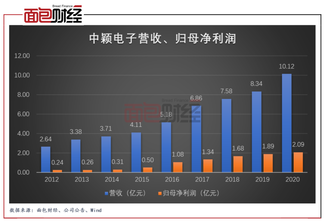 上市以来的2012年至2020年,中颖电子实现营业收入从2.64亿元上升至10.12亿元、归母净利润从0.24亿元上升至2.09亿元,年均复合增速分别达到18.28%和30.85%。伴随业绩增长,中颖电子的股价相较发行时也上涨超过了10倍,目前市值达到约200亿元。