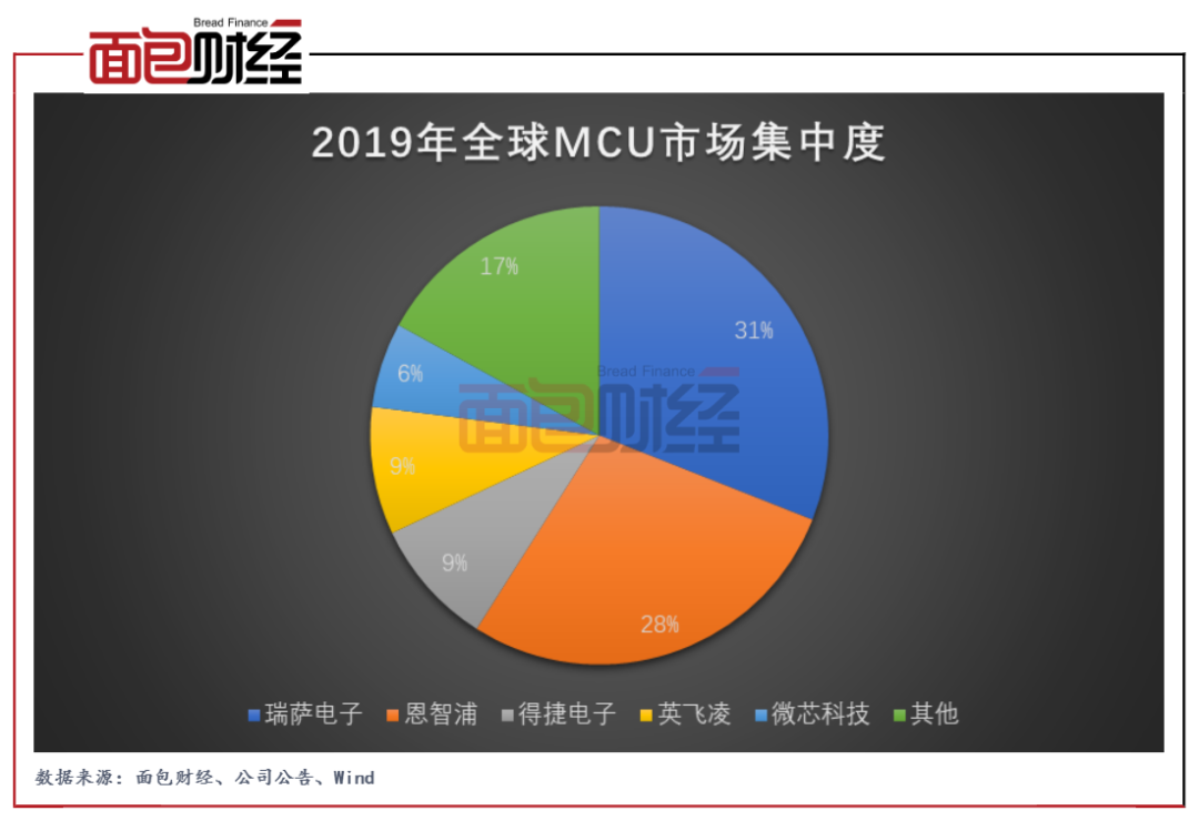 中颖电子面临的另一个风险是市场份额较小。东方证券研报数据显示,2019年全球前五大MCU行业参与者为瑞萨电子、恩智浦、得捷电子、英飞凌和微芯科技,市场份额达到83%。中国MCU市场集中度相对全球来说较为分散,前五大参与者占据55.2%的市场份额,且都被海外半导体大厂所占据。