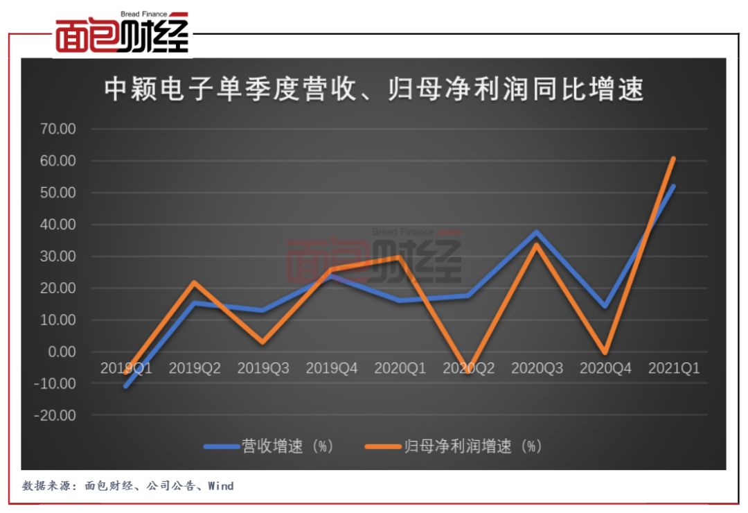 进入2021年以来,中颖电子业绩呈现加速增长的趋势。在2020年一季度较高业绩基数的基础上,公司2021年第一季度实现营收3.06亿元、归母净利润0.68亿元,同比分别增长51.95%和60.73%,两者增速均创2019年以来单季度新高。销售增长较快的产品主要为锂电池管理芯片及AMOLED显示驱动芯片。