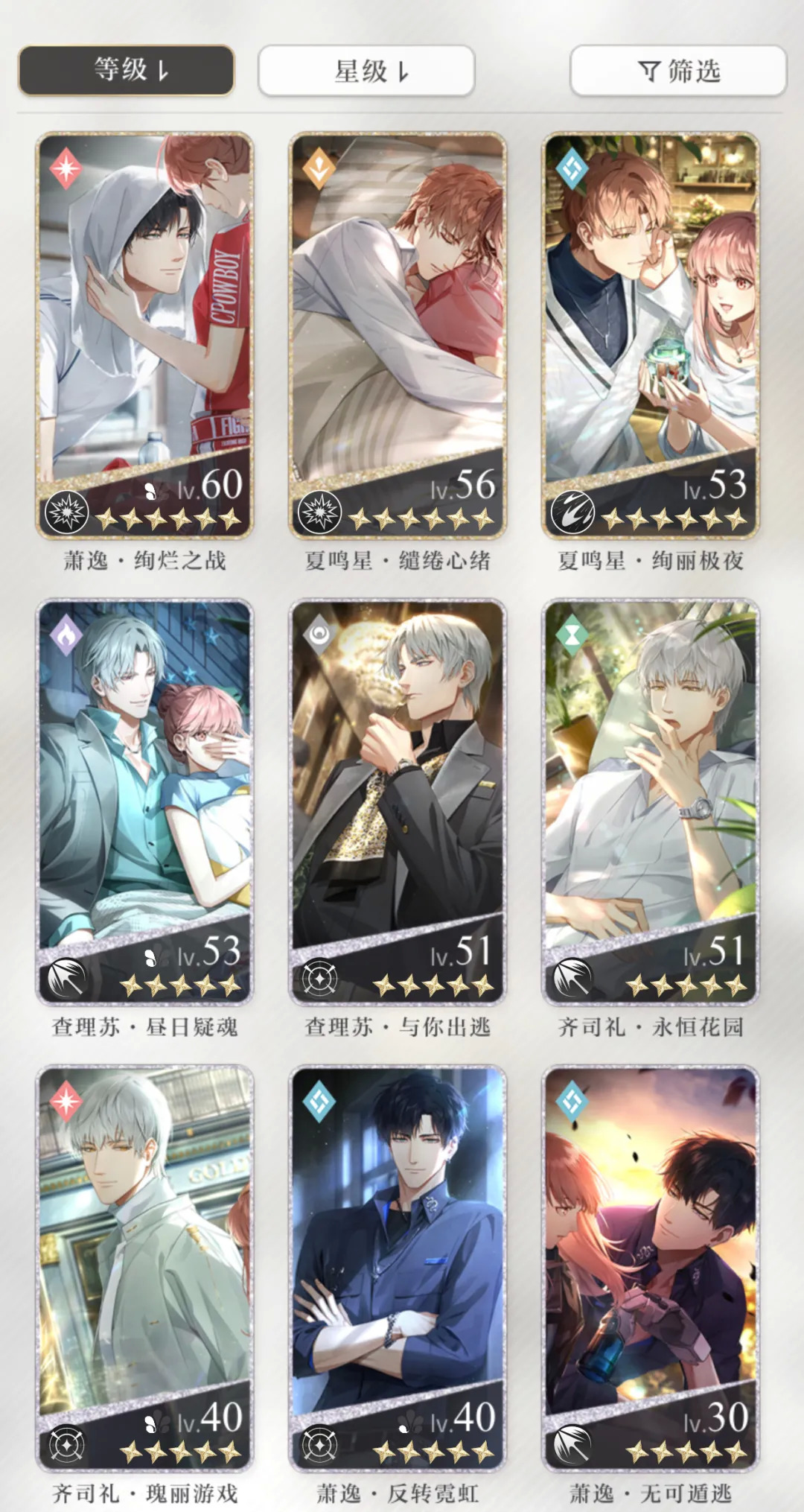 其一:“纸片人男友”最重要的优势就是颜值突出,因此,游戏里精良的卡牌设计界面和人物立绘,能够促使玩家不断抽卡。除此之外,《光与夜之恋》还给高星卡牌设置了“二段光影”,即另一种卡面,提供了多重新鲜感。