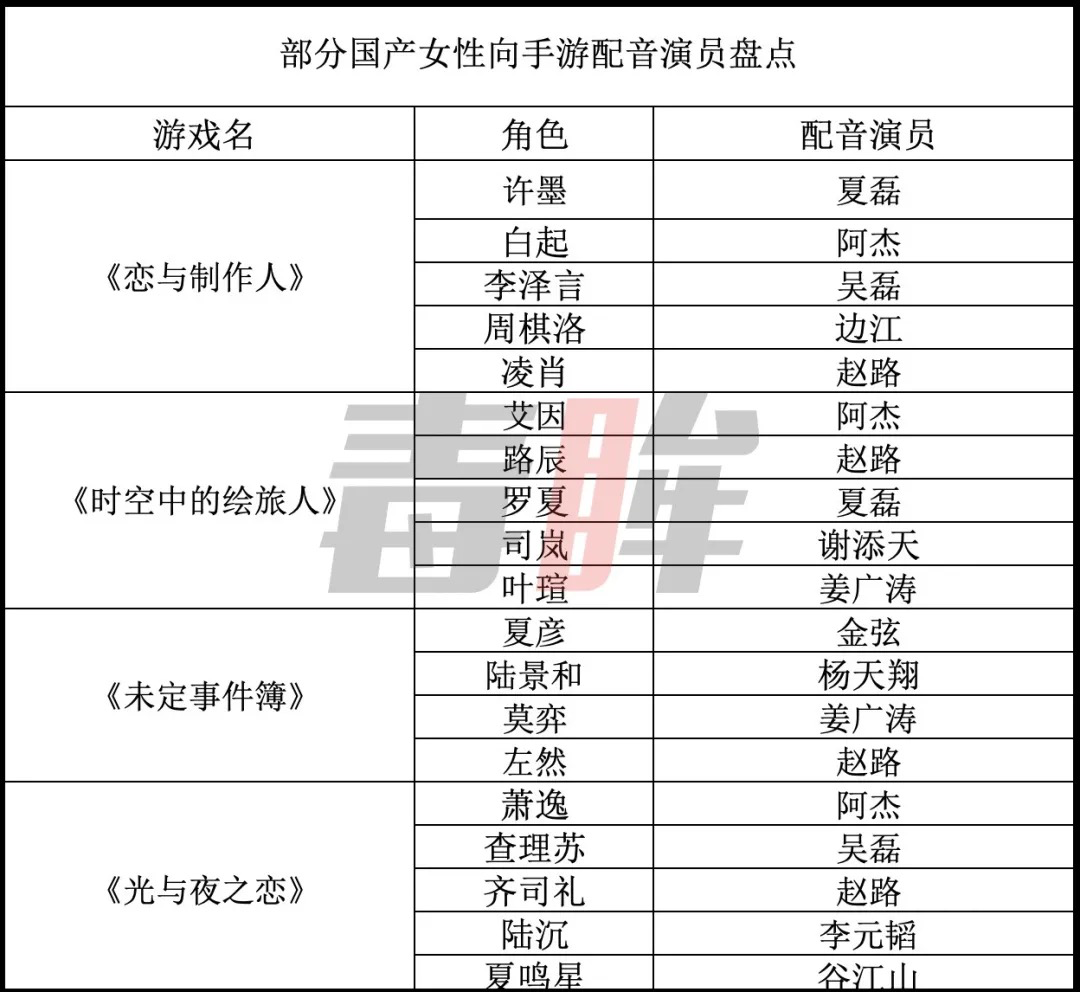 声优也是造成乙女游戏声优“同质化”的原因之一。诸如阿杰、赵路这类知名声优由于具有先天的粉丝基础,因此他们也会成为乙女游戏的首选。比如赵路就曾在四款乙女游戏中为不同性格的角色配音。