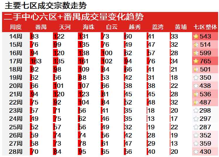 据“广州中原研究发展部”统计数据,上周(7.5-7.11)广州二手住宅共成交593宗,环比回升17.0%,周度成交量继续维持在600宗以下的低位水平。