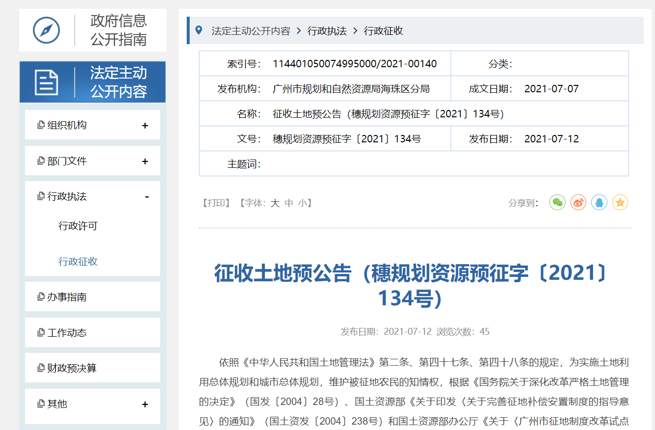 7月12日,广州市规划和自然资源局发布了一则征收土地预公告。