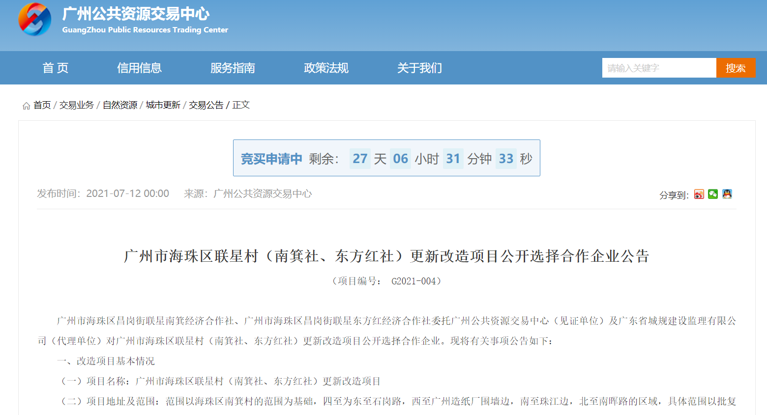 7月12日,广州公共资源交易中心发布了关于海珠区联星村(南箕社、东方红社)更新改造项目公开选择合作企业的公告。