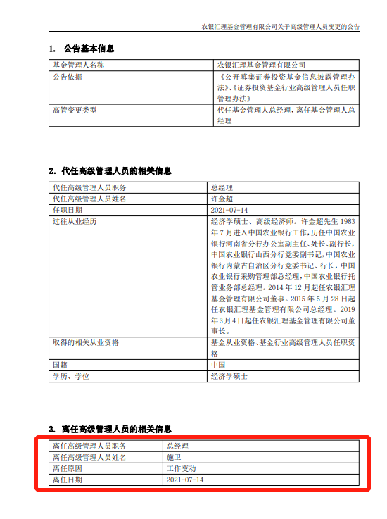 日前,农银汇理发布旗下关于高级管理人员变更的公告,公司原总经理施卫,因工作变动于2021年7月14日离任,由许金超代任总经理职位。
