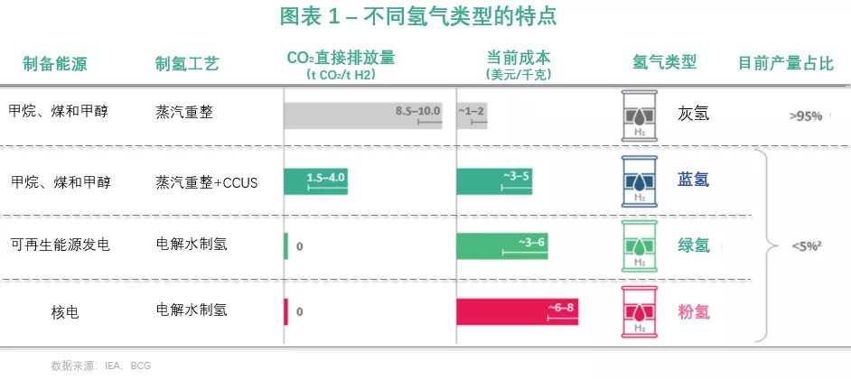 氢气可以采用多种工艺和能源制取,业界经常以颜色进行区分,诸如灰氢、蓝氢、绿氢。其中,满足低碳氢的碳排放阈值的氢气同时满足制备能源为可再生能源,则该氢气可定义为“绿氢”。