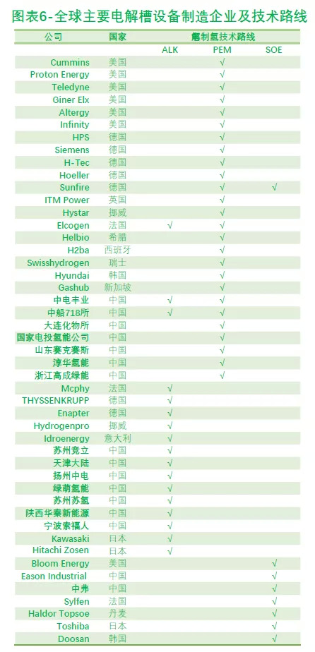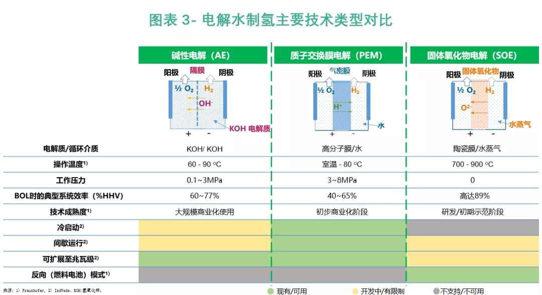 电解水制氢技术主要分为碱性水电解槽(ALK)、质子交换膜水电解槽(PEM)和固体氧化物水电解槽(SOE)三类。三种技术的原理及技术特点见图表3。