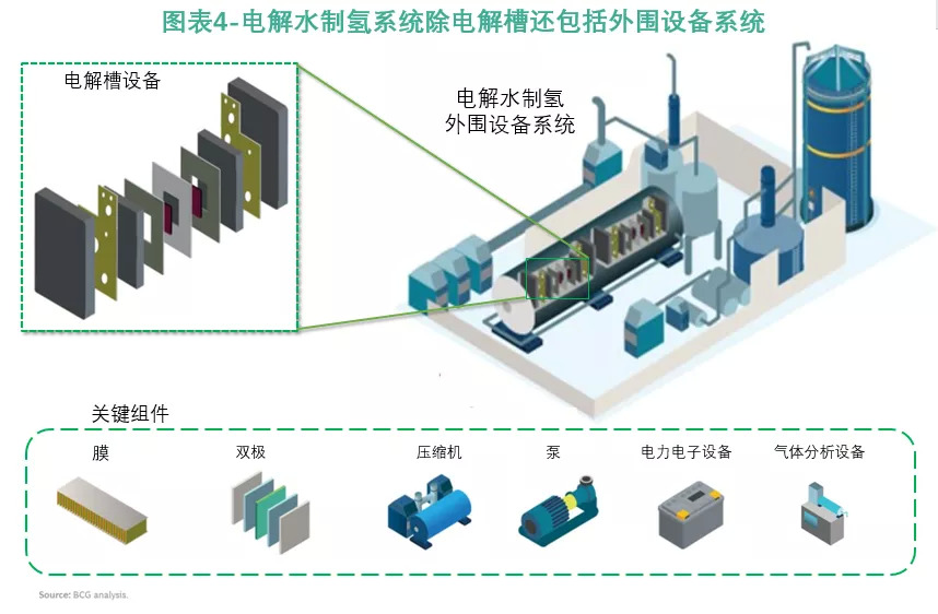 电解水制氢项目规模小,辅助系统成本较高。完整的电解制氢系统除了电解槽设备还需要大量外围辅助设备系统(包括压缩机、泵、缓冲罐、冷却设施等),目前单个项目的电解制氢装机容量相对较小,所需配备的外围组件系统成本占比就相对较高。