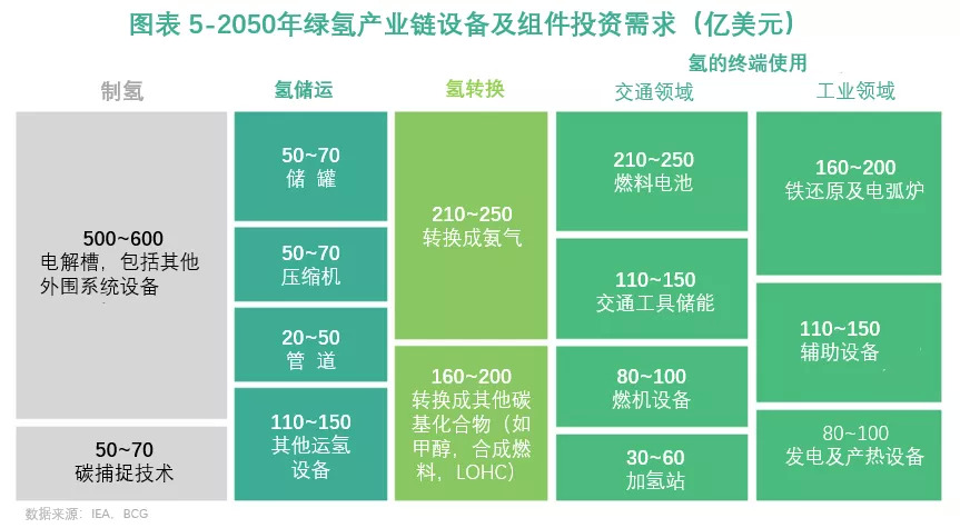 降本是电解水制氢的最大挑战,同时也创造了巨大的投资空间。根据BCG的预测,到2050年,全球绿氢产业链中每个环节所需的设备和组件投资总需求将达到2000亿美元/年,其中电解水制氢及外围辅助系统的设备及组件投资需求最高,达到500~600亿美元/年,占总投资需求的1/4。