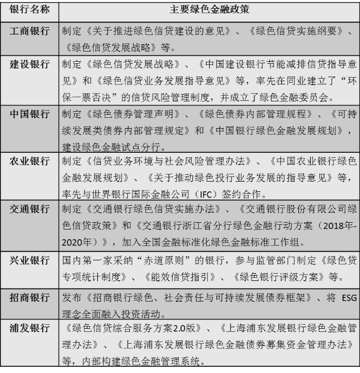 在绿色发展成为国家战略、成为国内外金融热点的背景下,我国商业银行深刻意识到发展绿色金融的重大意义,切实增强紧迫感,将绿色金融提升到战略高度。理念是行动的先导,商业银行以推动经济绿色发展、坚持绿色富国为己任,通过不断加强研究,布局管理,制定了一系列发展目标、产品体系、关键举措和机制保障,初步形成以国家战略为导向方针、银行自身特色为指引的顶层设计(如表1所示)。