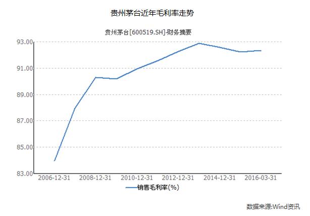 2008年之前,贵州茅台的毛利率保持在80%以上,2008年以来毛利率便稳定在90%以上,尤其是2012年至今,公司毛利率已上升至92%上方了。2016年一季度,贵州茅台的毛利率为92.34%,实属暴利行业。这也成为投资者认可其价值而坚持投资的最大理由。