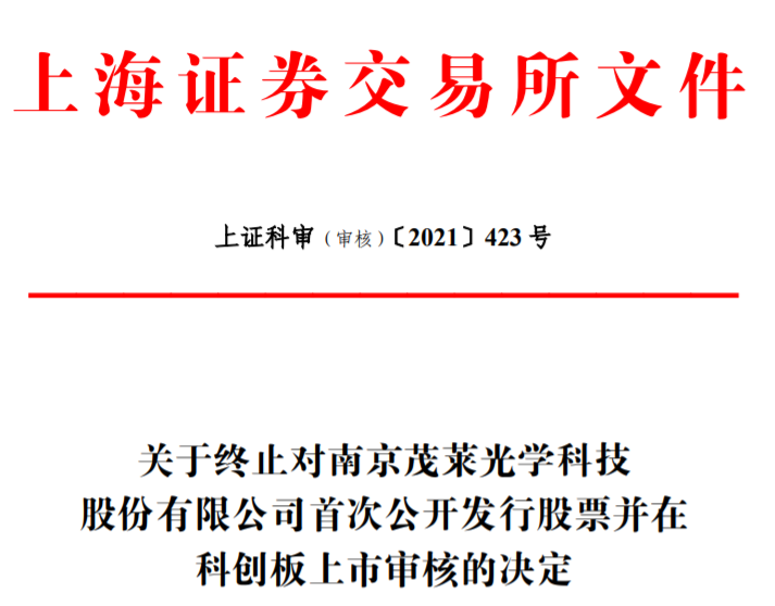 据上交所官网7月19日消息,因发行人撤回发行上市申请或者保荐人撤销保荐,上交所决定终止对南京茂莱光学科技股份有限公司首次公开发行股票并在科创板上市的审核。