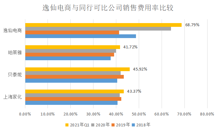 数据显示,2018年-2020年及2021年第一季度,与其市值体量相仿的公司中,逸仙电商的销售费用率要高出三家均值10%左右。